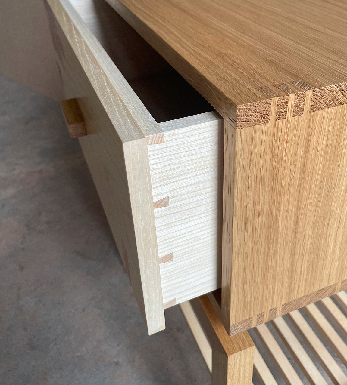2 oak and ash bedside tables each with a drawer and shelf.  The drawer incorporates a hand cut marquetry front.
